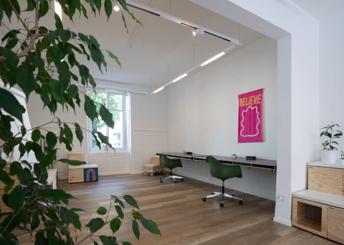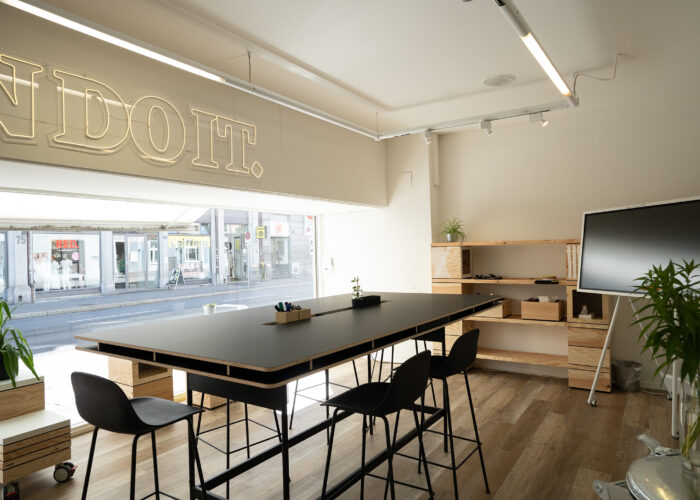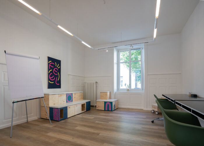 Der Raum verfügt über einen digitalen Flipchart (55') mit Audioausgabe sowie Standardflipcharts und weiteren Präsentationswerkzeugen. Mindestmietdauer beträgt drei Stunden.